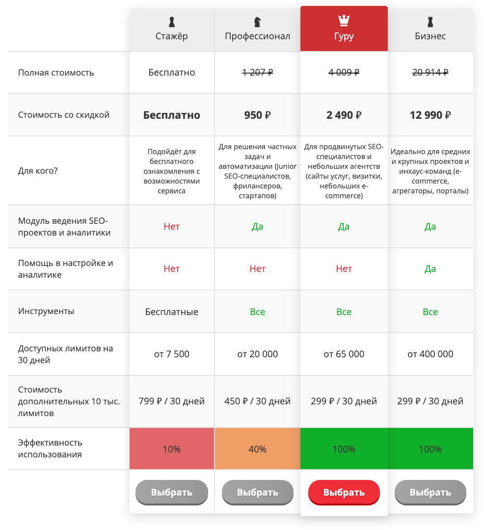 Система тарифов полностью обновилась. Теперь использовать 59 инструментов и «Модуль ведения SEO-проектов» выгоднее минимум в 3 раза. Почему минимум? Любой тариф можно приобрести с дополнительной скидкой 10 или 30% при оплате на 90 или 365 дней соответственно. Выбрать тариф Проекты на всех тарифах без ограничений на количество фраз Теперь в проект-модуле можно добавить любое количество целевых фраз. Периодичность проверок и аудитов зависит только от числа доступных лимитов на вашем тарифе. Дополнительные лимиты всегда можно выгодно купить, а также участвовать в программе лояльности или делегировать в пользу сервиса. Кроме того, проект можно завести и потестировать даже на тарифе «Стажёр». Ещё не познакомились с возможностями Модуля? Посмотрите базовый FAQ и YouTube-плейлист с подробным обзором функционала и примерами решения SEO-задач. «Бизнес» — новый тариф Идеальное решение для средних и крупных проектов и инхаус-команд, продвигающих интернет-магазины, агрегаторы или контентные сайты