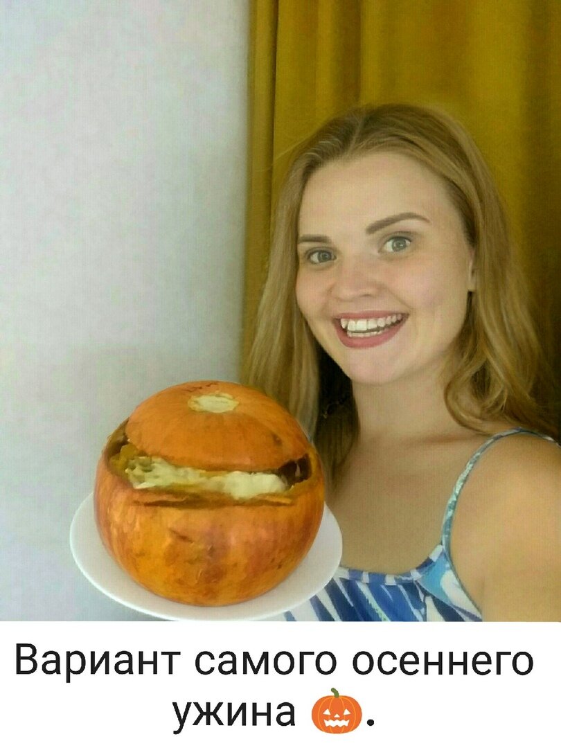 Крестная сказала Золушке: " Сбегай-ка в огород и принеси мне тыкву". Золушка побежала в огород и нашла самую... Не было в моей жизни такой феи и Золушкой мне назвать сложно. Но переворачивая календарь, где снова 3 сентября, я понимаю, что сегодня моя очередь готовить ужин для всей семьи. И тыква тут, пришлась очень даже кстати. Встречаем, вариант самого осеннего ужина для всей семьи "Фаршированная тыква". Для этого нам понадобиться: - маленькая тыква - куриная грудка (свинина, говядина, тут выбирать Вам. У меня в холодильнике как раз была свежемороженая курица.) -грибы свежие или замороженные -сметана -сыр - сливочное масло - соевый соус - приправы+соль+1 листочек лаврушечки - 2 дольки чеснока Теперь приступаем к приготовлению. Так, как многие сорта тыквы очень жёсткие и не всегда поддаются хозяйским ножам и даже топорам, то советую вам отправить нашу королевну 🎃 на 20 минут в микроволновку на максимальном режиме, так сказать, чтобы смягчить ее нрав и природную твердыню. После этог