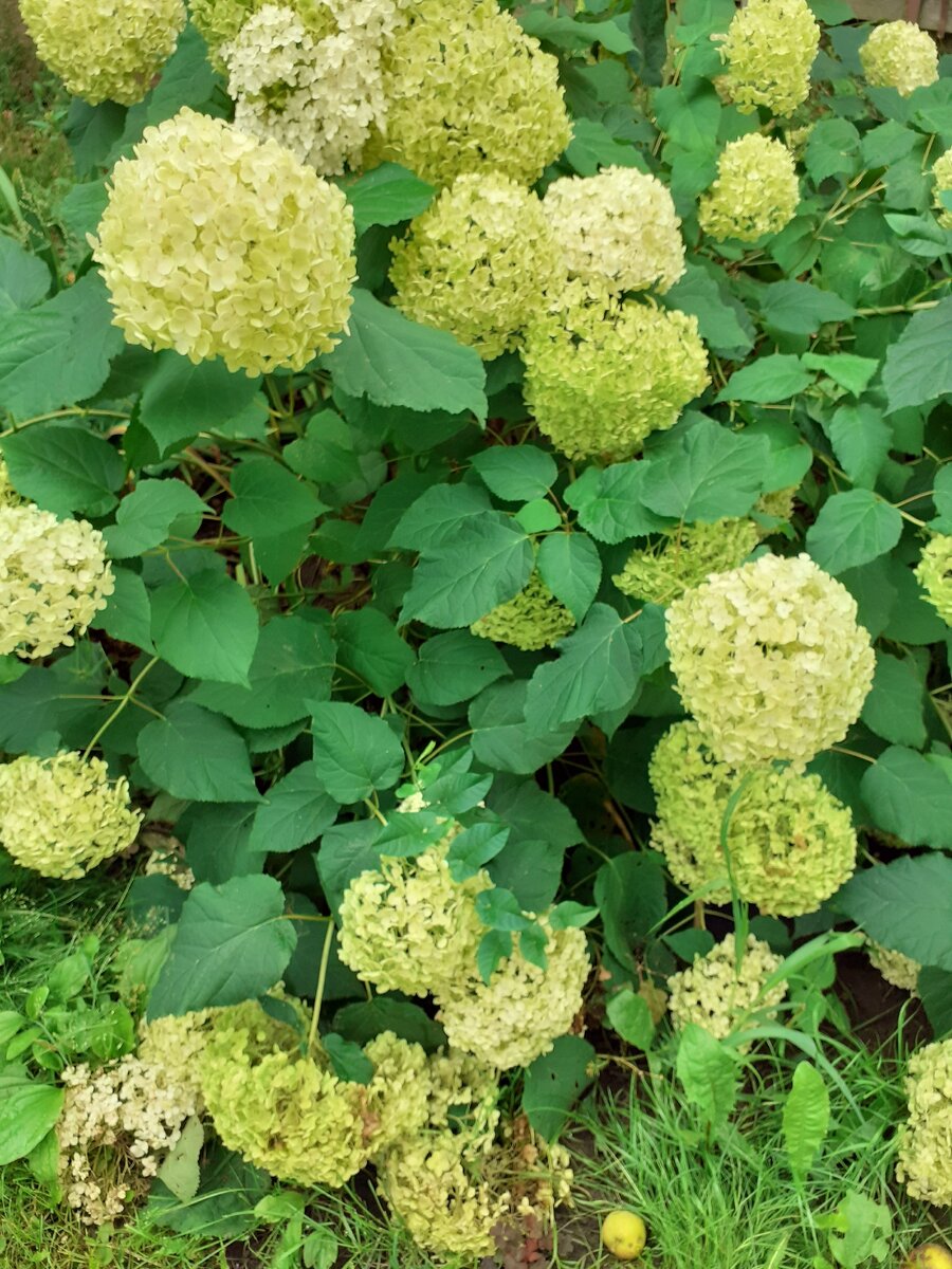 У нас, в Калужской области, очень многие выращивают древовидную гортензию - простую, обильно цветущую,с бело-зелёными цветками и даже неизвестно, как называется сорт (похожа на Аннабель). Она очень неприхотливая, может расти даже в тени под деревьями, только, если находится в тени, то цветы дольше цветут и долго имеют зеленоватый оттенок. Фото это с нашего старого участка, сейчас мы там не хозяйничаем, но от этого куста я, конечно же, взяла себе черенок, который укоренила и посадила на новом нашем месте. Саженец пока маленький и дал всего пару цветочков. Схожи в уходе с этой гортензией и гортензии метельчатые, они имеют вытянутые вверх конусом цветоносы: Недавно знакомая меня спросила: что нужно осенью сделать с такими гортензиями, чтобы они на следующий год тоже красиво и обильно зацвели? Оказывается, что не все люди знают, как правильно за ними ухаживать и боятся обрезать засохшие цветы, боятся подрезать стебли, а, между тем, это нужно сделать, чтобы куст имел декоративный вид, чтоб