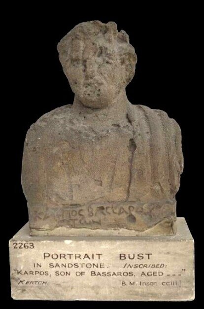 Эта керченская скульптура сегодня украшает Британский музей. По-английски дублируется сохранившаяся надпись: "Карпос, сын Бассароса, в возрасте ..." Предположительно, памятник был установлен более полутора тысяч лет назад. В Британии он появился в 1856 году, как раз после того, как войска антироссийской коалиции разграбили Керчь.
