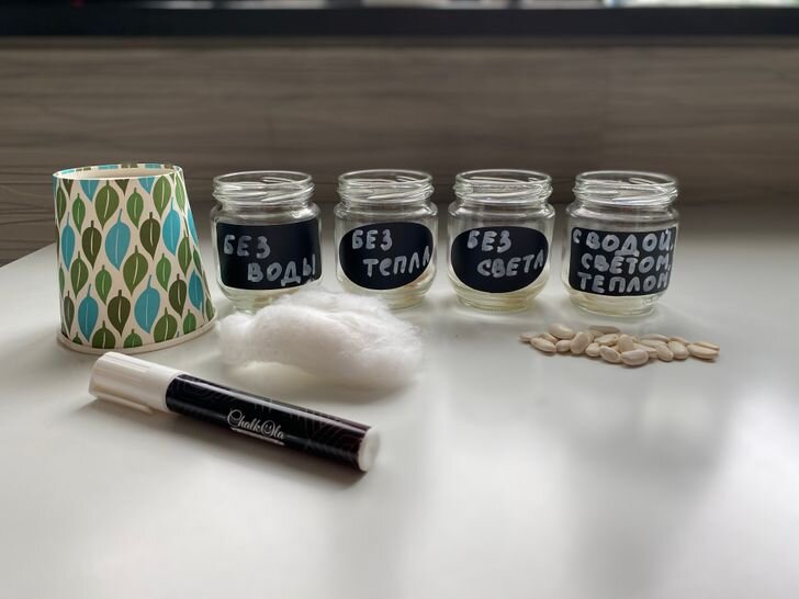 - Наклеиваем на баночки этикетки: «Без воды», «Без тепла», «Без света», «С водой, светом и теплом».