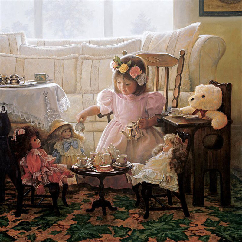 Белый мишка огорчился – кукла очень строгая. Чаем чуть не подавился, чашку лапой трогая.