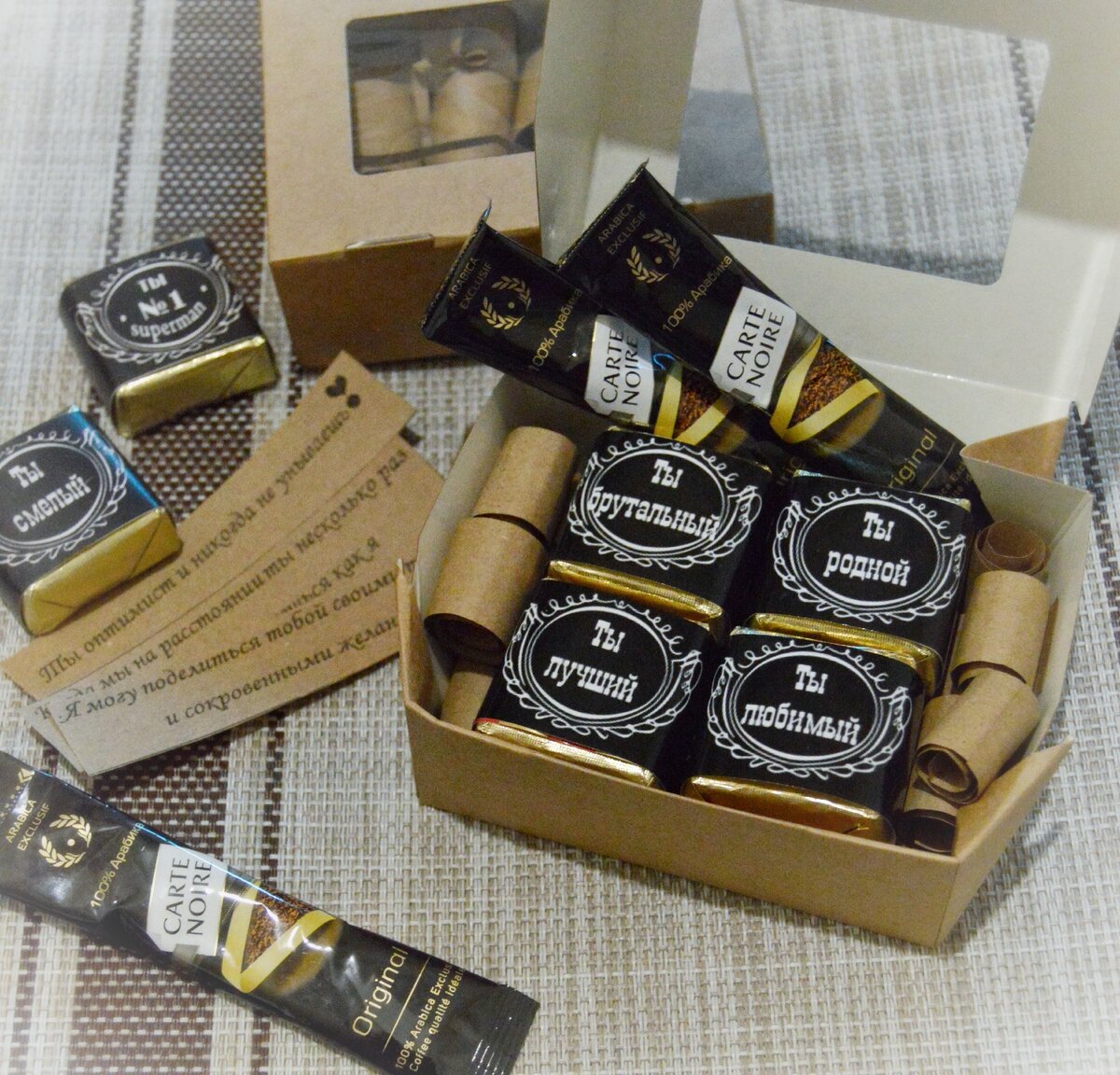 Добавила парочку пакетиков растворимого кофе, немного бумажного наполнителя и все упаковала в крафтовую коробочку (ее я купила в отделе всё для кондитеров).
