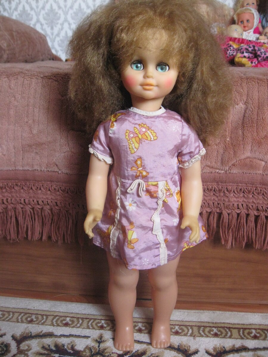 Итак, знакомьтесь - Оленька, Донецкой фабрики игрушек. Это большая девочка, 56 см. Тельце и ножки у нее твердые, пластмассовые, а ручки и головушка резиновые. Надо сказать, что, вероятно, от времени, ручки и головушка очень трудно повернуть. У девочки очень густые, мягкие, пушистые волосы. Когда она только приехала. я очень переживала, что они свалялись и я не смогу прочесать их. Волнения оказались напрасны. Волосы очень легко расчесываются. По окружности головы у куколки идут короткие волосы. что придает прическе больший объем.