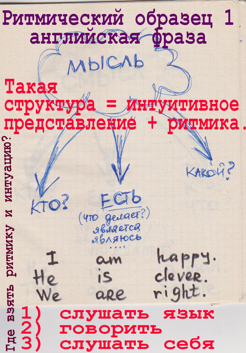 - формирование интуитивного употребления правильной английской фразы: владение подлежащим, сказуемым и возможным объектом при сказуемом, а также освоение порядка слов в предложении. На начальном этапе необходимо освоить три ритмико-грамматических образца: