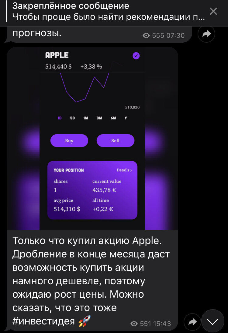 Привет! Мы хотим поделиться интересной новостью. Наши читатели могли заметить, что с недавних пор мы начали рекомендовать подписаться на наш телеграм канал. Изначально идея была создавать обучающий контент, например пояснения к индикаторам или фигурам на графике (все еще периодически постится). Однако, потом пришла мысль выискивать инвест-идеи на рынке и рекомендовать подписчикам совершенно #бесплатно (в то время, когда большинство "трейдеров" просят большие деньги за такие рекомендации). Тем самым создавая большую ценность контента. Этим мы и занялись. К слову, на канал попадают только "избранные" идеи, которые имеют минимальный риск и сопровождаются аналитикой по входам и выходам из позиции. У нас даже появился свой хэштег, по которому можно отследить все идеи и их результаты, вы можете проверить сами, зайдя на канал и нажав на #инвестидея