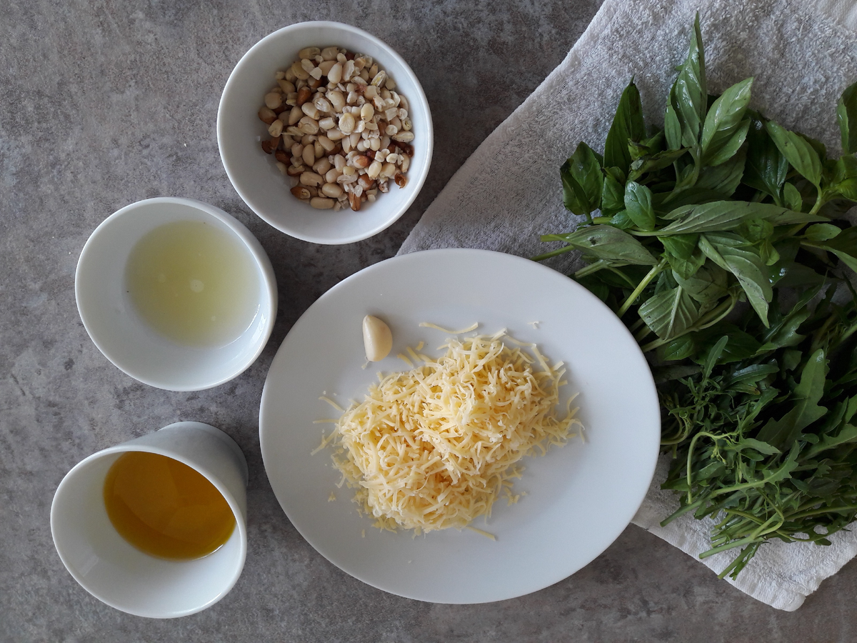 30-40 граммов кедрового ореха или грецкого, слегка поджаренные на сковороде, 1 маленький зубочек чеснока (или половинка зубчика), пучок зеленого базилика, несколько веточек петрушки (можно добавить так же кинзу, рукколу), 100-150 мл оливкового масла, немного соли и черного молотого перца, столовая ложка сока лимона, натертый сыр пармезан - 50 гр. - все взбить в блендере. Соус готов! Его можно хранить в банке в холодильнике 3-4 дня.