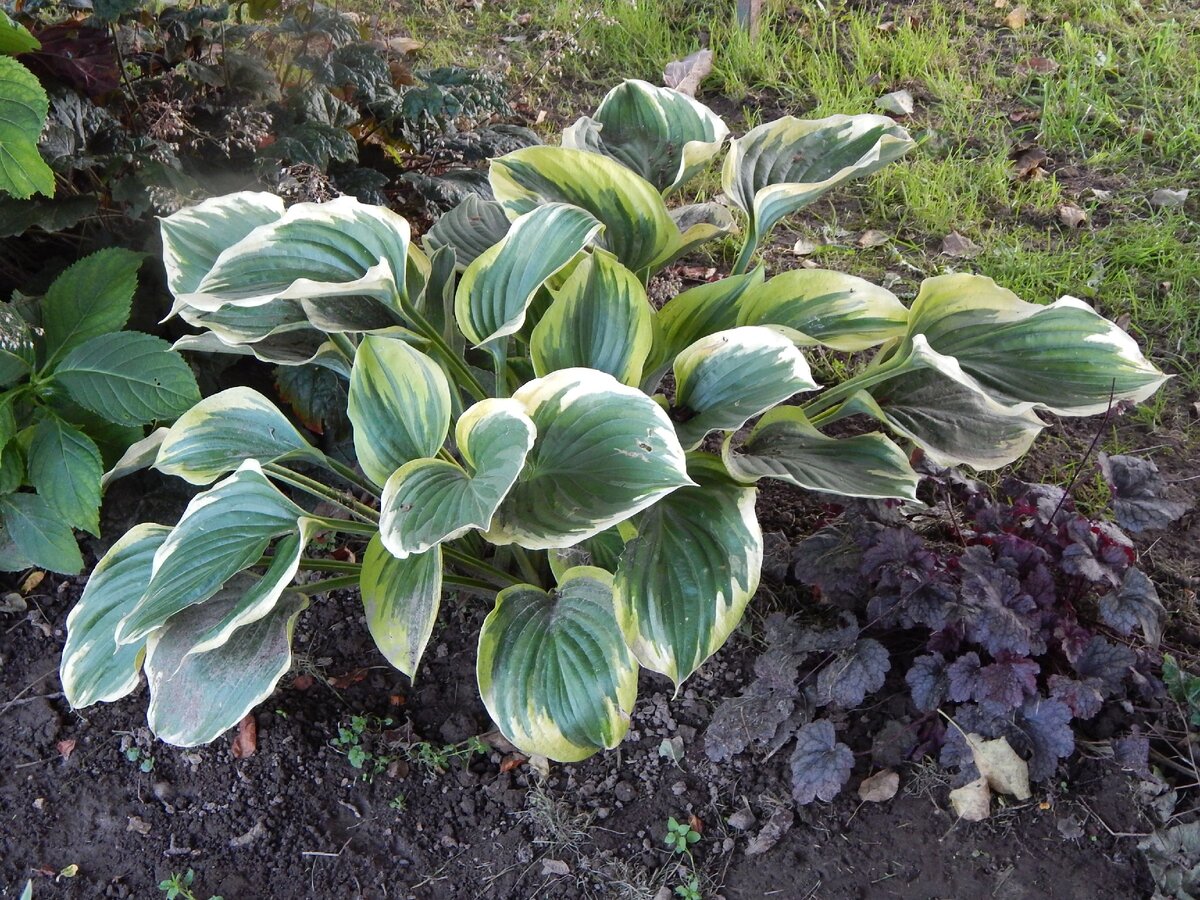 В первой половине сентября хосты всё ещё хороши. Их листья, правда, уже слегка затронуты непогодой, на некоторых сортах рисунок размыт, а кое-где похозяйничали слизни. Но несмотря на эти небольшие огрехи, смотреть на них по-прежнему приятно.