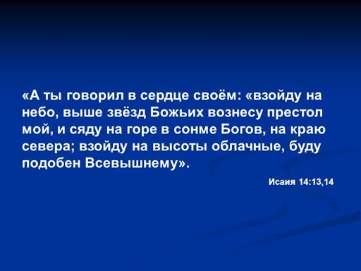 «А говорил в сердце своём: "Взойду на небо, выше звёзд Божиих вознесу престол мой и сяду на горе в сонме богов, на краю севера; взойду на высоты облачные, буду подобен Всевышнему". Но ты низвержен в ад, в глубины преисподней. Видящие тебя всматриваются в тебя, размышляют о тебе: "Тот ли это человек, который колебал землю, потрясал царства, вселенную сделал пустыней и разрушал города её, пленников своих не отпускал домой?" Все цари народов, все лежат с честью, каждый в своей усыпальнице; а ты повержен вне гробницы своей, как презренная ветвь, как одежда убитых, сражённых мечом, которых опускают в каменные рвы; ты, как попираемый труп, не соединишься с ними в могиле; ибо ты разорил землю твою, убил народ твой: вовеки не помянется племя злодеев. Готовьте заклание сыновьям его за беззаконие отца их, чтобы не восстали и не завладели землёй и не наполнили вселенной неприятелями. "И восстану на них, — говорит Господь Саваоф, — и истреблю имя Вавилона и весь остаток: и сына, и внука, — говорит Господь. — И сделаю его владением ежей и болотом, и вымету его метлой истребительной", — говорит Господь Саваоф» (14:13-23).