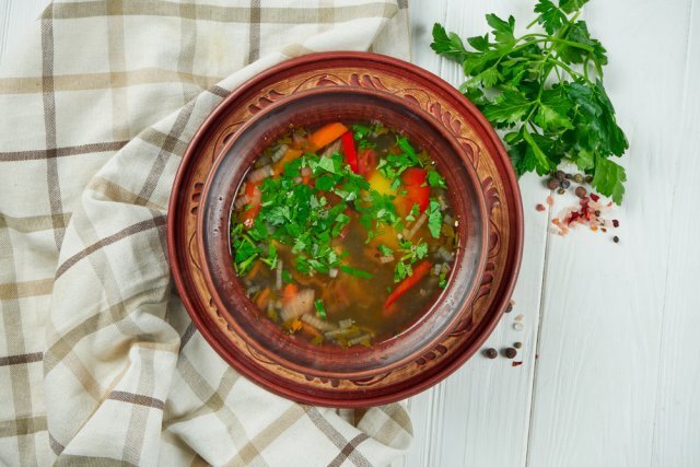 Вам понадобятся: 1 кг говяжих ребрышек, 600 г картофеля, 300 г копченой свиной грудинки, 300 г репчатого лука, 200 г сладкого перца, 200 г томатов, 2 средние моркови, половинка острого перца, немного укропа и петрушки, 2 головки чеснока, 3 ст.л. паприки, 1 ст.л. соли (или по вкусу).