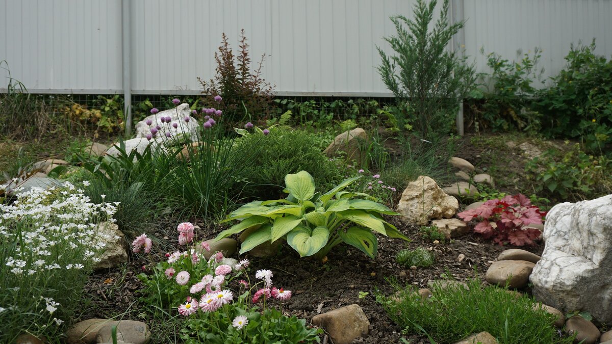 У вас на участке есть насыпь? А может это естественый склон? Если да, то самое время задуматься о создании альпинария. Я поделюсь с вами личным опытом. На моем участке имелось место со склоном и мне пришла идея создать альпийскую горку на естественном склоне. От предыдущих владельцев нам досталось много камней, самые большие камни были добыты моим мужем и получены в дар от друзей, которым они были не нужны. В итоге, затраты на альпинарий сводились только к покупке посадочного материала. Первым делом я выбрала основу этой садовой группы, в которую вошли следующие растения : Можжевельник скальный «Скайрокет» Туя западная «Боулинг Болл» Гортензия крупнолистная «Шнеебол» Хоста гибридная «Голд Стандарт» Барбарис Оттавский «Сильвер Майлс» Овсянница сизая «Элиджан Блу» Подготовила посадочные ямы, соответствующие размерам каждого растения, и создала «скелет» будущего альпийского склона, с перспективой подсадки почвопокровных и небольших многолетних растений. Только в обезличенных ста
