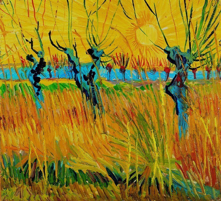 Постриженные ивы на закате. 1888 г. Одна из наименее известных работ Ван Гога, "Постриженные ивы на закате" предъявляет зрителю удивительный пейзаж на закате, выполненный быстрыми и грубыми, энергичными мазками, где все сфокусировано на золотом солнечном свете. Слияние света и красок являются уникальным приемом в технике художника. " Моя работа продвигается и я принес сегодня домой полотно под номером 15. Это подъемный мост с маленькой повозкой переезжающей его, силуэтом на фоне голубого неба - река голубая тоже, берега оранжевые и зеленые, группа прачек, одетых в блузы и разноцветные боннеты. И еще один пейзаж, с маленьким замшелым мостом и прачками, снова. И последний - аллея простых деревьев недалеко от станции. Всего 12 зарисовок с тех пор, как я приехал сюда." Это то, что Ван Гог написал своему брату Тео в середине марта 1888 года. Вероятнее всего, это именно один из тех 12 этюдов, которые упоминаются в письме.