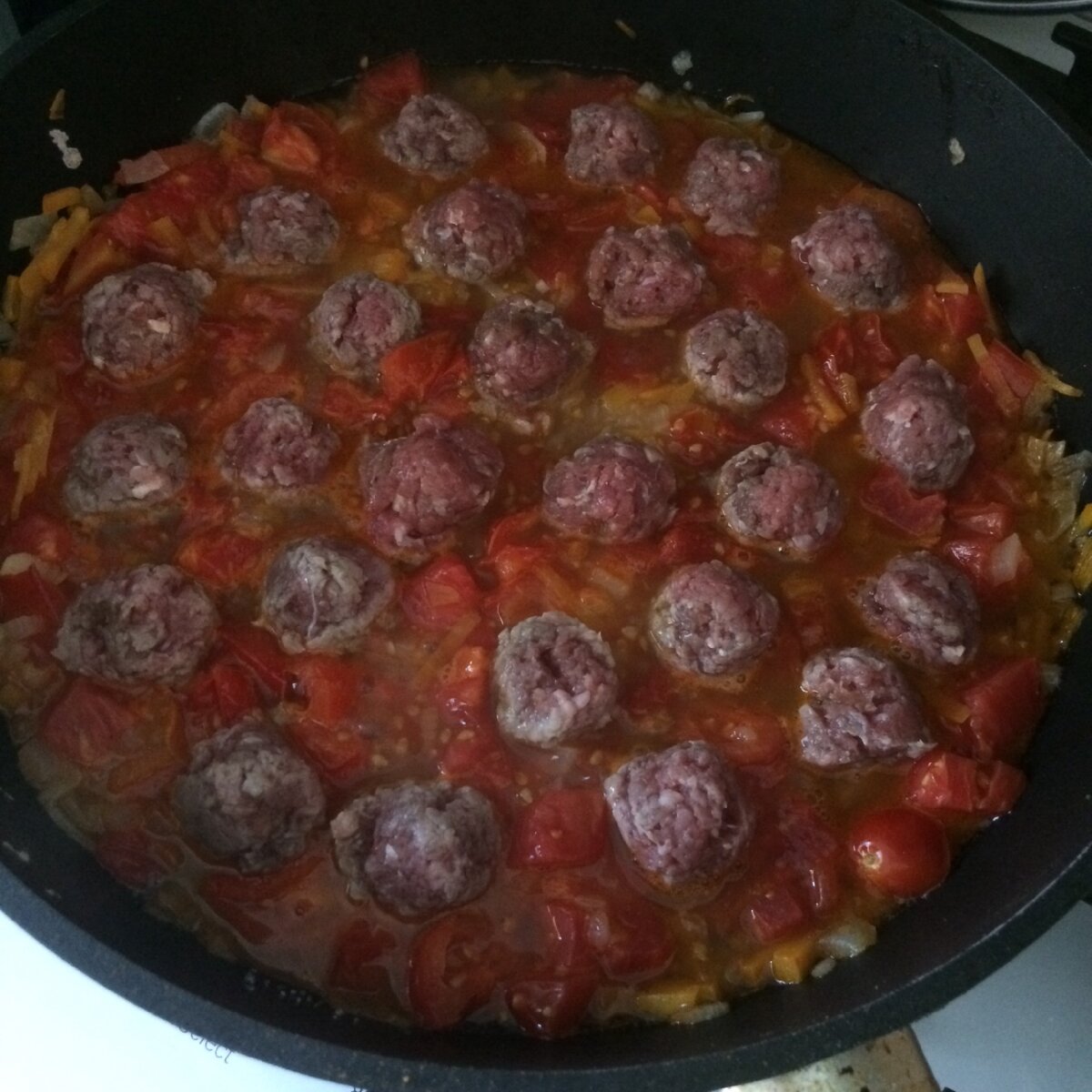 Посмотрела, что в холодильнике в наличии. Нашла фарш, овощи с дачи. Нарезала лук, немного моркови, пару болгарских перцев и на сковородку. Немного потушила, добавила туда же штук пять мясистых подрезанных кусочками помидор. Выложила маленькие тефтельки из фарша, как любят мои дети. И оставила тушиться до готовности. Специи добавить по вкусу, можно ещё травами посыпать. На гарнир у нас спагетти со шпинатом. Но гречка, рис, картофельное пюре тоже вполне подходят!