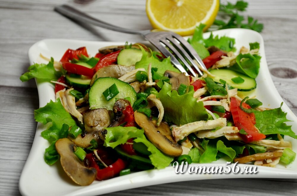 Куриное филе можно готовить по-разному, но у жареного мяса всегда самый соблазнительный вкус. Болгарский перец одинаково полезен в любом виде, побывав на сковороде, он усиливает свой аромат. Шампиньоны жарят до мягкости, они не должны хрустеть. Лучше взять крупные грибы, из них получатся отличные поджаренные слайсы. Салат из курицы и овощей можно взять с собой на работу, завернув в тонкий лаваш.