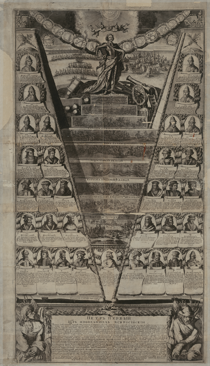 Гравюра "Апофеоз воинской славы Петра" превозносит царя Петра Великого (1672–1725 гг.) как мудрого правителя и полководца. На гравюре Петр представлен в полный рост на постаменте с изображением баталий, в окружении портретов 33 царей и князей, правивших Россией с IX в. до начала царствования Петра в 1682 г. Под портретами представлена краткая информация о каждом правителе. Позади Петра изображена цепь, составленная из планов крепостей, захваченных им в сражении. Гравюра была заказана русским государственным и церковным деятелем, богословом Феофаном Прокоповичем (1681–1736 гг.). Он был идеологом реформ Петра и сторонником просвещенного неограниченного самодержавия. В письме, датируемом концом марта или началом апреля 1717 г., сказано, что Прокопович составил генеалогию Петра и отправил ее царю для просмотра и утверждения. Гравюра выполнена в 1717 г. голландским художником и гравером Питером Пикартом, который в 1702 г. приехал в Россию, где им было создано множество карт и гравюр. Гравюра хранится в Российском государственном историческом архиве в Санкт-Петербурге.
