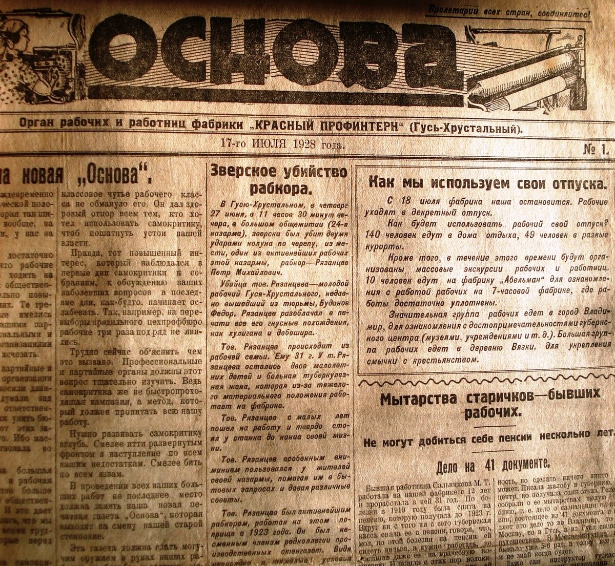 17 июля 1928 года можно смело отмечать, как «День рождения гусевской периодической печати». Появившийся на свет первый номер газеты «Основа», является «печатным органом рабочих и работниц фабрики «Красный Профинтерн» и с передовицы обращается к читателю: «В проведении всех наших больших работ не последнее место должна занять наша новая печатная газета, которая выходит на смену старой стенгазете. Она должна стать могучим оружием в руках наших рабочих в борьбе с нашими язвами в быту и на производстве, основой строительства новой социалистической жизни на фабрике «Профинтерн».