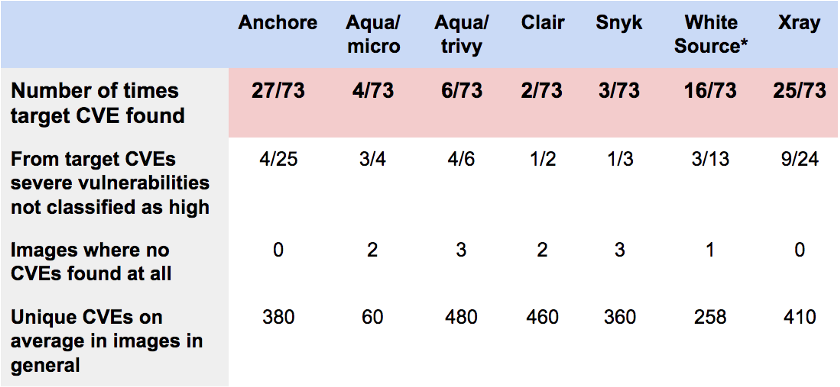 Тем же автором проведено исследование эффективности выявления неисправленных уязвимостей сканерами безопасности docker-контейнеров и уровень ложных срабатываний (часть 1, часть 2, часть 3). Ниже показаны результаты тестирования 73 образов, содержащих известные уязвимости, а также дана оценка эффективности определения наличия типовых приложений в образах (nginx, tomcat, haproxy, gunicorn, redis, ruby, node).