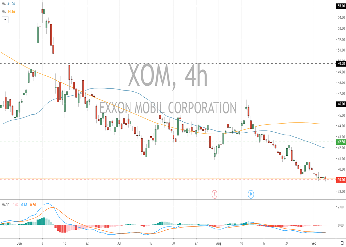 Акции Exxon Mobil завершили вчерашнюю торговую сессию на уровне 5-месячного минимума, отражая 7% нисходящий тренд с публикации квартального отчёта с результатами ниже ожиданий The Wall Street в конце июля. Выручка сократилась более чем в два раза до 32,6 миллиарда долларов, скорректированный убыток на акцию составил 0,70 доллара по сравнению с прошлогодней прибылью. Компания сокращает капитальные инвестиции 2020 года на 30% с ещё большим снижением в 2021 году для сохранения дивидендной доходности на уровне 9%.