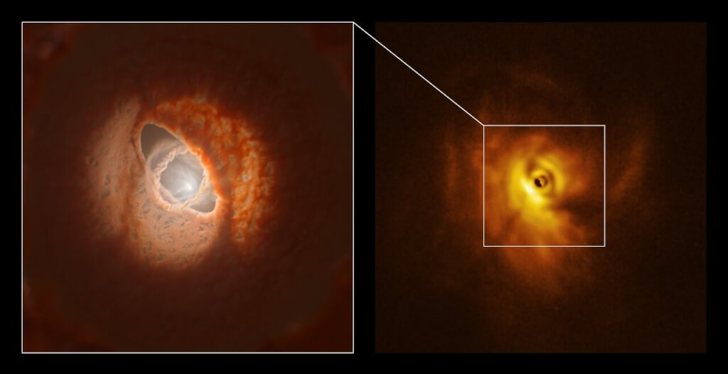 Новые наблюдения показали, что этот объект имеет изогнутый протопланетный диск и выступающее кольцо. В частности, изображение из СФЕРЫ (правая панель) позволило астрономам впервые увидеть тень, отбрасываемую кольцом на остальную часть диска. Это помогло установить трехмерную форму кольца и всего диска. На левой панели показано художественное видение внутренней части диска, включая кольцо. Чертеж основан на трехмерной форме, восстановленной исследовательской группой.