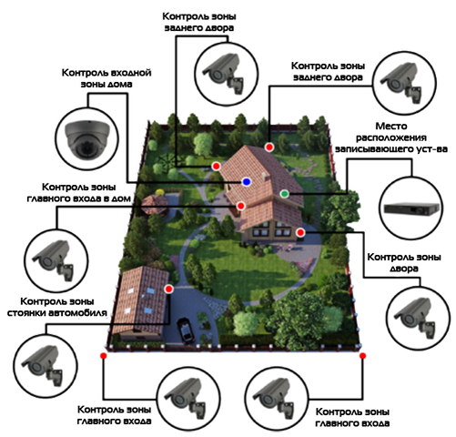 С этой задачей обычно справляют 4-6 аналоговых камер. Все камеры желательно монтировать непосредственно на дом что бы мы могли фиксировать пересечение периметра и у злоумышленника не было возможно добраться до