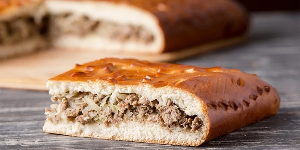 Русский мясной пирог Ингредиенты: 3 столовые ложки муки 1 столовая ложка молока 50 грамм дрожжей 100 грамм маргарина 1/2 чайной ложки соли 1 столовая ложка сахара 1 яйцо для смазывания Для начинки: 300 г отварного мяса 1 луковица бульон соль и молотый перец(по вкусу) 2 вареных яйца Способ приготовления: Приготовить дрожжевое тесто. Раскатать его и разделить на две неодинаковые части. Большую часть положить на противень, сверху выложить приготовленную начинку(отварное мясо пропустить через мясорубку вместе с луком,посолить,поперчить,добавить немного бульона и мелко нарезанные вареные яйца).вторую часть теста раскатать,накрыть пирог и защипать края. Сверху смазать яйцом и сделать вилкой проколы.Выпекать в духовке при 180 градусах . Остывший пирог нарезать прямоугольными кусочками.
