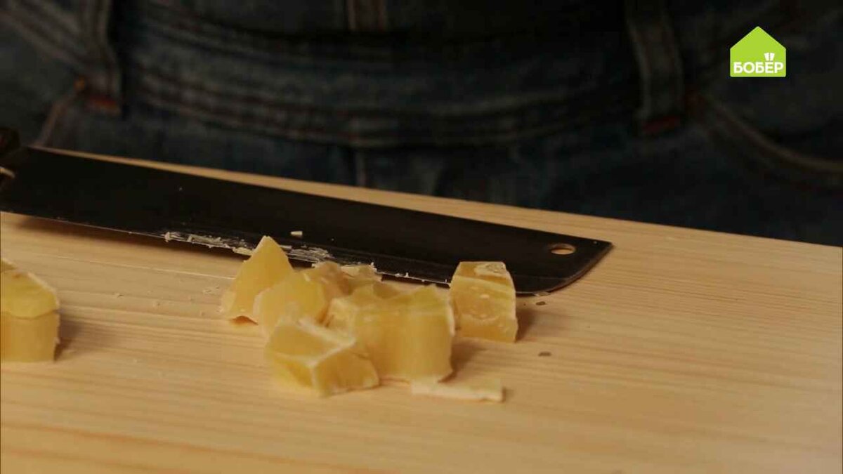Возьмите натуральный пчелиный воск и при помощи ножа нарежьте его на мелкие кусочки. Парафин в данном случае не подойдёт, поскольку это продукт химического производства и он более жёсткий.