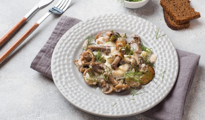 Простое в приготовлении и при этом необыкновенно вкусное блюдо с потрясающим грибным ароматом. Время приготовления Общее 45 мин. Активное (требуется ваше участие) 15 мин. Ингредиенты Опята 450 г Лук 1 штука Сливочное масло 2 ст. ложки Сметана 200 г Соль по вкусу Твёрдый сыр 150 г Зелень по вкусу Приготовление