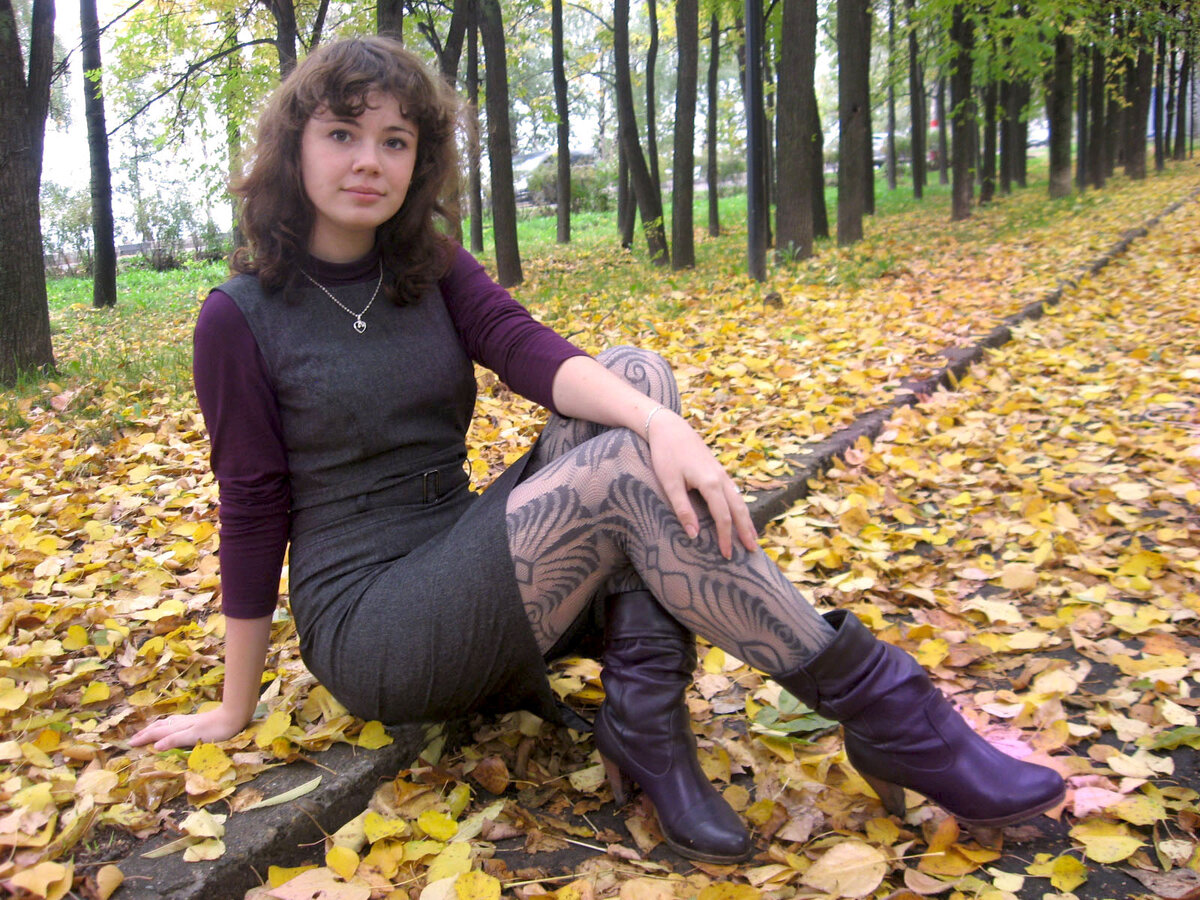 Очень бросаются в глаза фантазийные колготки на фотографиях с листвой и с юбкой А-силуэта. Колготки с рисунком — это аксессуар. Они привлекают внимание к ногам и визуально увеличивают ноги (подумайте, нужно ли вам это?).