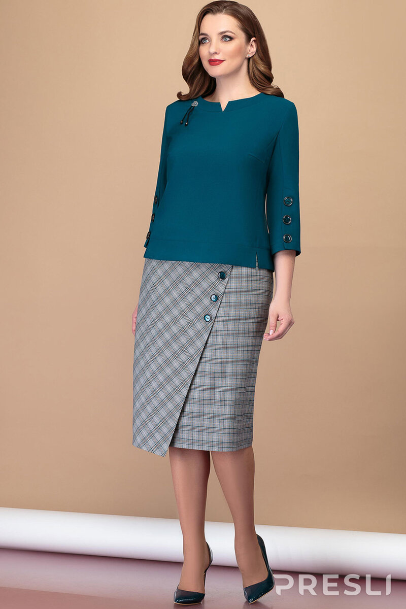 Первый образ. Глубокий цвет морской волны в сочетании с клеткой в серых тонах смотрится замечательно. Из украшений - только пуговицы. А изюминка этого образа - отлетная пелерина по переду.