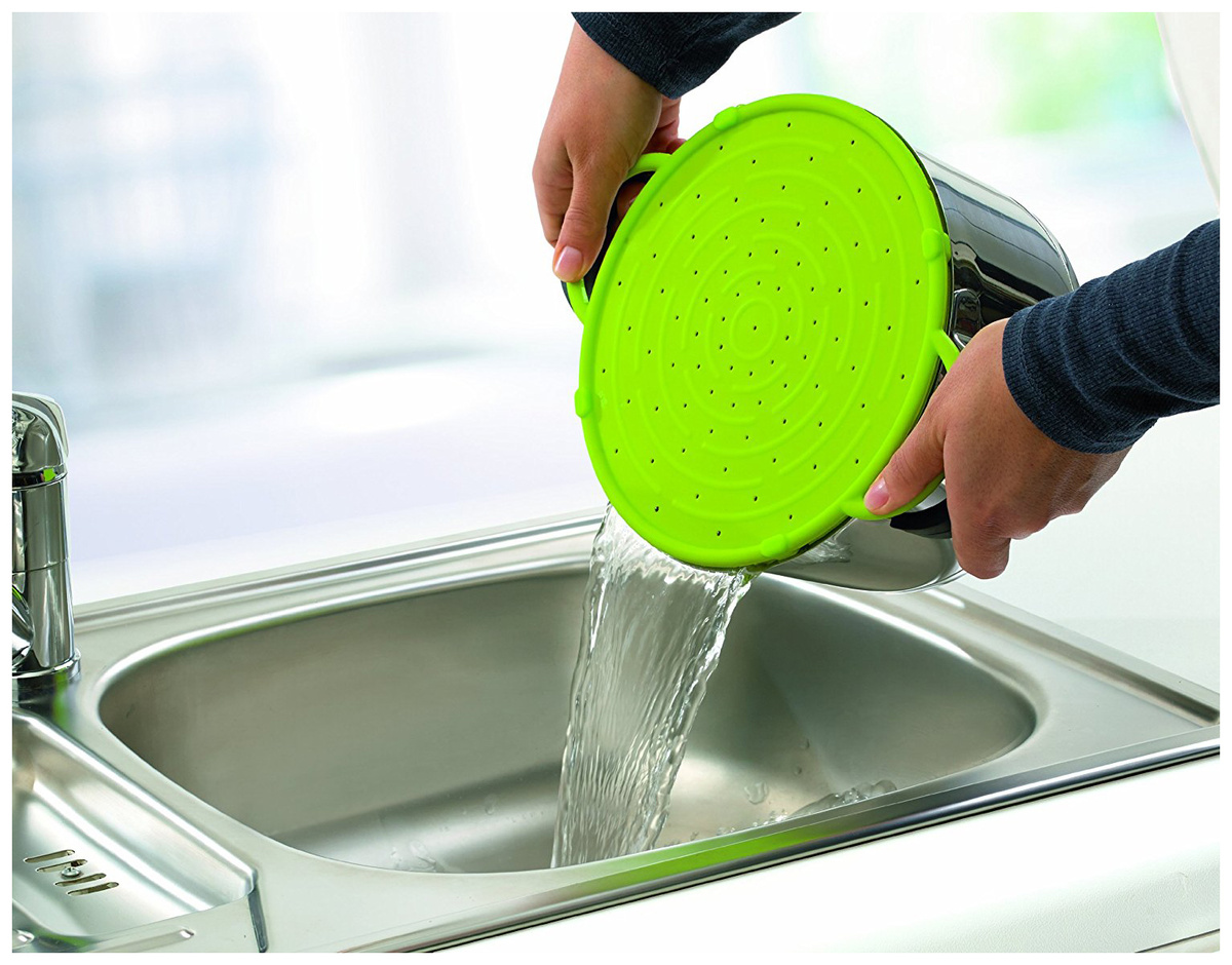 После варки круп и овощей из кастрюли необходимо слить горячую воду. Обычно для этого используется крышка или дуршлаг, что не всегда удобно. Есть риск получить ожог от кипятка. Также содержимое кастрюли может вовсе вывалиться в раковину. Чтобы этого не произошло, рекомендуется использовать защитную крышку-экран. Она полностью закроет содержимое тары, ее будет удобно держать в руках и не понадобится использовать крышку от кастрюли.