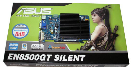 Не у всех есть возможность приобрести производительную видеокарту, а кто-то в ней не видит необходимости, но и те и другие могут захотеть провести час-другой своего свободного времени за компьютерной игрой. В таком случае подбирается видеокарта, обладающая минимально необходимым уровнем производительности, при минимальном вложении средств. Один из возможных вариантов, который вполне соответствует предъявленным требованиям, плюс работает полностью бесшумно, мы и рассмотрим – ASUS EN8500GT SILENT. Видеокарта поставляется в большой, несоразмерно самой видеокарте, картонной коробке. На упаковке указаны лишь некоторые особенности продукта, но заметно подчеркнута бесшумность системы охлаждения. Комплектация Комплектация видеокарты очень скромная: ASUS EN8500GT SILENT Видеокарта выполнена на синем текстолите и отличается обновленной разводкой, хотя и очень похожей на референсную, но с реализованной возможностью объединения двух таких видеокарт в SLI-конфигурацию. Несмотря на использование п