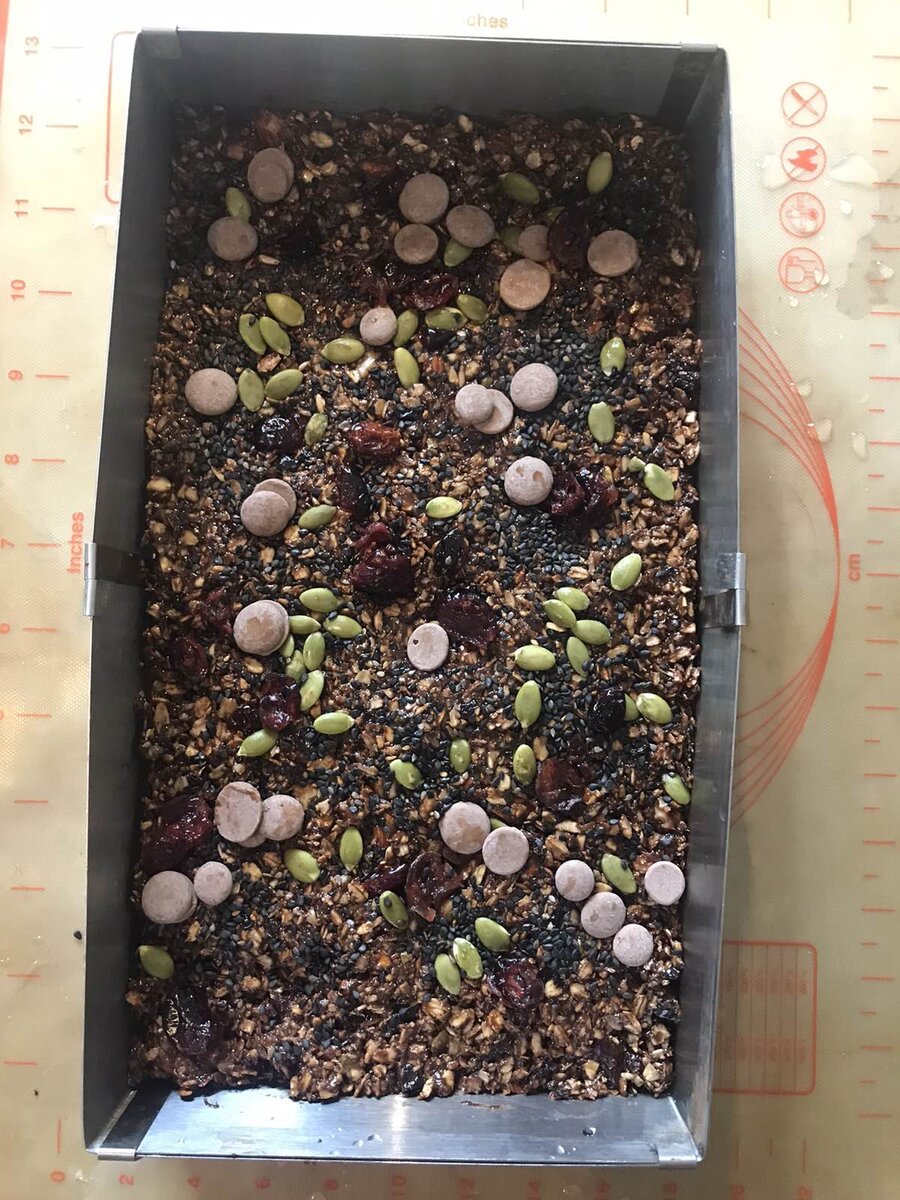 Предлагаю приготовить очень вкусные и полезные баточники-мюсли. Их очень удобно брать с собой в школу, на работу и даже на завтрак с горячим кофе они очень хорошо зайдут Для приготовления этих вкусных и полезных батончиков нам потребуется 250 граммов овсяных хлопьев 100 граммов меда 90 граммов сухофруктов 80 граммов орехов и семечек в любых пропорциях 80 граммов шоколада 70 граммов сливочного масла Сначала необходимо на разогретой сковороде немного прокалить овсянку. Буквально три-четыре минуты. И ее запах и вкус станут ароматнее и насыщеннее. Я беру овсяные хлопья исключительно длительного приготовления, поскольку она самая полезная, но если вы любите овсянку помягче, то берите ее. А можно и смешать два вида овсяных хлопьев. После, на этой же сковороде рекомендую слегка прогреть орешки и семечки, это их дополнительно простерилизует и сделает чуть ароматнее. Далее следует тщательно промыть сухофрукты и промакнуть их бумажным полотенцем, чтобы убрать лишнюю влагу. Далее слегка измельчим