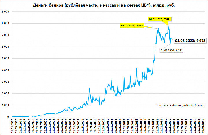 Даже на таком графике видно, что с июля 2018 года деньги банков не растут, а колеблются вокруг отметки 7 триллионов рублей.