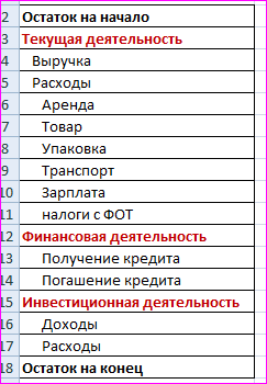 Чтобы пример был наглядным добавим поступления и расходы по финансовой (ФД) и инвестиционной деятельности (ИД).