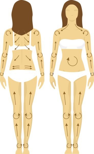 Как правильно делать сухой массаж щёткой,чтобы твое тело было подтянутым ? Все движения должны быть направлены снизу (начиная с ног) в область сердца, по движению лимфотока. По началу массаж может показать неприятным, но спустя несколько сеансов привыкаешь. Главное - растирать тело щёткой и не давить слишком сильно. Растирание делается снизу-вверх, примерно по 10 раз на 1 зону. Необходимо НЕ затрагивать паховую область, подмышки и другие зоны с расположением лимфоузлов. На рисунке показана самая обычная схема массажа щёткой: Соответственно, прямая стрелка — движение вверх, круговая - движение по кругу. На массаж тратится не более 15-20мин в день. Ежедневно - нет, только чередуя дни со скрабированием, так как эти методы должны работать в комплексе. Прежде, чем приступать к массажу, убедись, что на коже нет порезов, ушибов и воспалительных заболеваний (типа экземы). Массаж сухой щеткой противопоказан людям с тонкой, очень сухой и чувствительной кожей, варикозом или большим кол