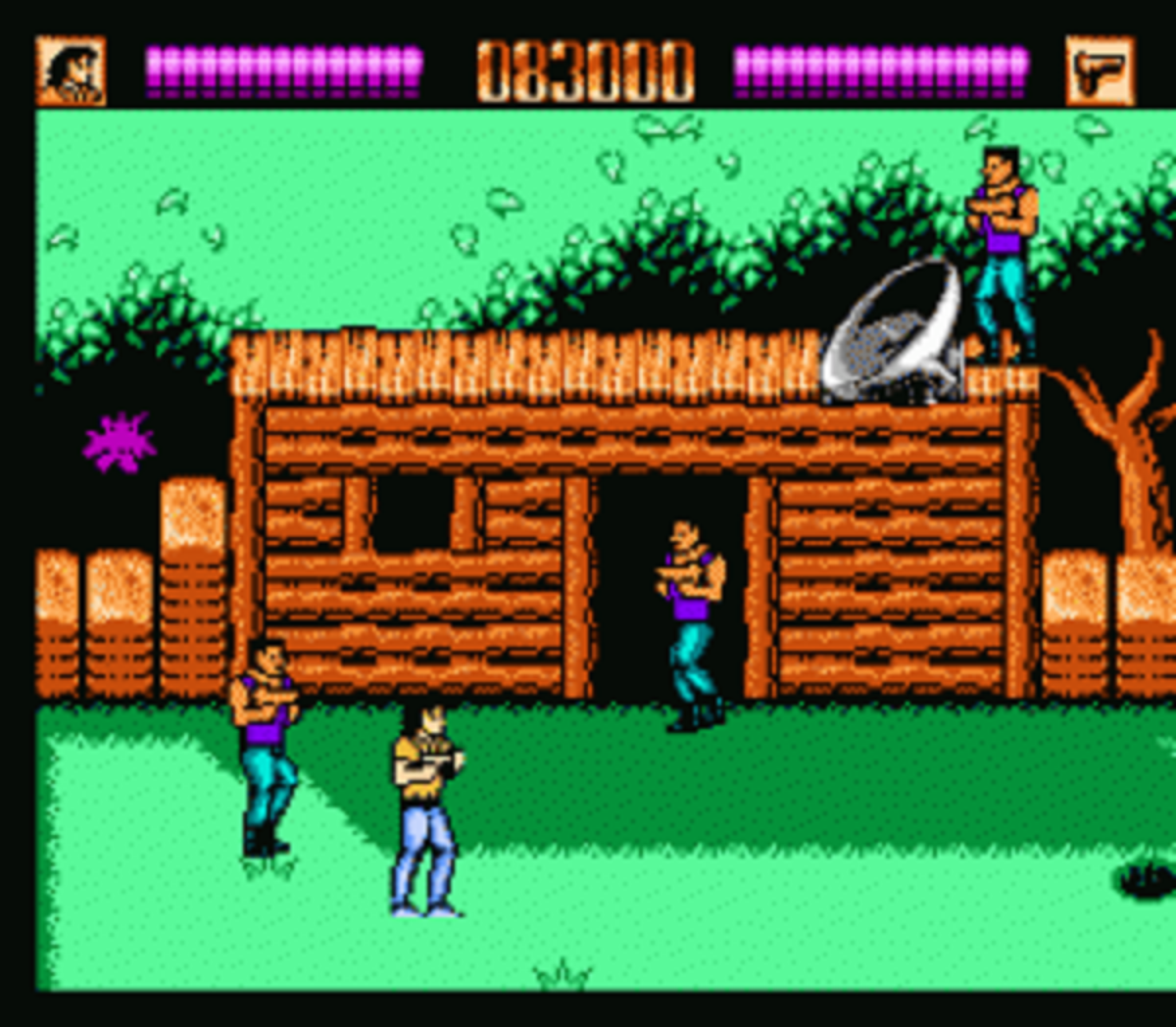 Да-да, вы не ослышались! Одноимённая игра, созданная по кинолицензии фильма «Смертельное оружие» с Мелом Гибсоном и Дэнни Гловером в главных ролях. Восьмибиткам созданным по лицензии одноимённых фильмов и мультфильмов очень часто не везло и они парой получались просто отвратительными. Бывало и так, что игры по лицензиям фильмов, выходившие на приставки с шестнадцатью или тридцатью двумя битами получались даже лучше восьми битных игр, но главное интереснее, а восьми битные собратья напоминали вымиравшую какашку. Однако, если углубиться в игру, то можно заметить, что возможно игра могла бы стать лучше. Учитывая и то, что игру делали в жанре Beat ’em up, то это не плохой выбор жанра игры, ибо игры выходящие с таким жанром часто получаются хорошими, даже не смотря на то, что со временем некоторые из них надоедают и обвиняют в повторяемости, ведь по сути кроме мордобоя в них ничего нового то и нет. Плюс все враги лёгкие и умирают с одного удара игрока, что делает и саму игру лёгкой, а значит от того она должна быть и интереснее. На графику в целом можно не обращать внимания, ибо на восьми-битках всегда такие грехи в отличии от шестнадцати битных игр. Плюс не смотря на ограничения цветов у спрайтов в восьми битной приставке в четыре цвета, один из которых прозрачный, разработчикам удалось уместить по две цветовой палитры для каждого персонажа, это заметно по штанам у каждого персонажа и двух игроков, за которых мы играем. Вернее за одного из них, а поменять их можно, просто зайдя за левый угол экрана. Что кстати очень даже полезно, ведь если например у первого игрока осталось очень мало здоровья, а впереди босс, то он может поменять его на второго игрока с полной полоской здоровья и играть дальше за него + можно время от времени находить аптечки и попалнять полоски здоровья только тому игроку у которого маленькая полоска, даже если у другого игрока она полная.