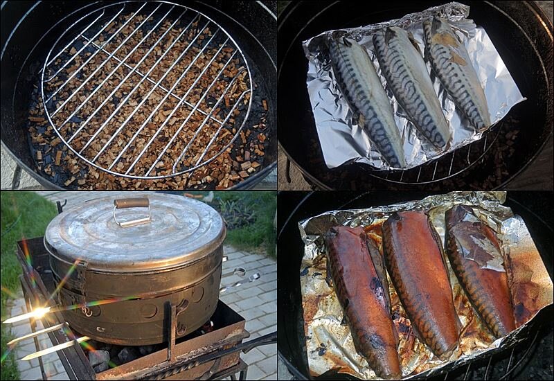 Поверх щепы поставить поддон, в него будет стекать жир и сок рыбы. Если поддон отсутствует, можно
