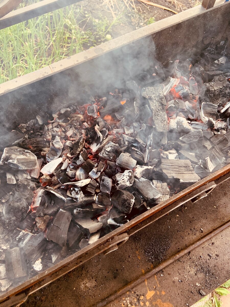 Уголь мы покупаем уже готовый, в пакетах. Раньше разжигали дрова, но так гораздо быстрее и удобнее. Засыпаю его в мангал, поливаю жидкостью для розжига, жду минут 5-7, чтобы уголь как следует пропитался, а затем поджигаю его газовой горелкой. Вот и все, очень быстро получается. Через 10 минут, как только огонь погаснет, а уголь как следует разогреется, можно ставить мясо))) Пока уголь разогревается, мы его как раз насадили: