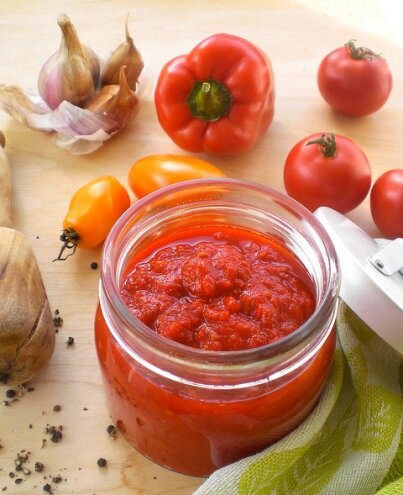 Лютеница - болгарская закуска из помидоров и сладких перцев. Также - соус, приправа. Название, происходит от слова «лютый», то есть «сильный», «чрезмерный». Ингредиенты: на 10 кг сладкого перца - 3 кг спелых помидоров, 1 стакан подсолнечного масла, 15 г молотого красного острого перца, 50 г зелени сельдерея, 1 головка чеснока, 20 г соли, 15-20 г сахара. Зрелый мясистый сладкий перец вымыть, удалить семенники с семенами, ополоснуть, мелко нарезать и опустить в кипящую воду. Варить до готовности, затем протереть через сито. Помидоры вымыть, нарезать дольками, подогреть до полного размягчения и тоже протереть через сито. Чеснок и зелень порезать на мелкие кусочки. Пюре из помидоров и сладкого перца смешать, уварить до загустения, после чего растворить в нем соль, сахар, прибавить острый перец, чеснок, зелень и масло. Смесь в горячем виде расфасовать в литровые стерильные банки и стерилизовать 40-50 минут, затем укупорить. ПРИЯТНОГО АППЕТИТА!!