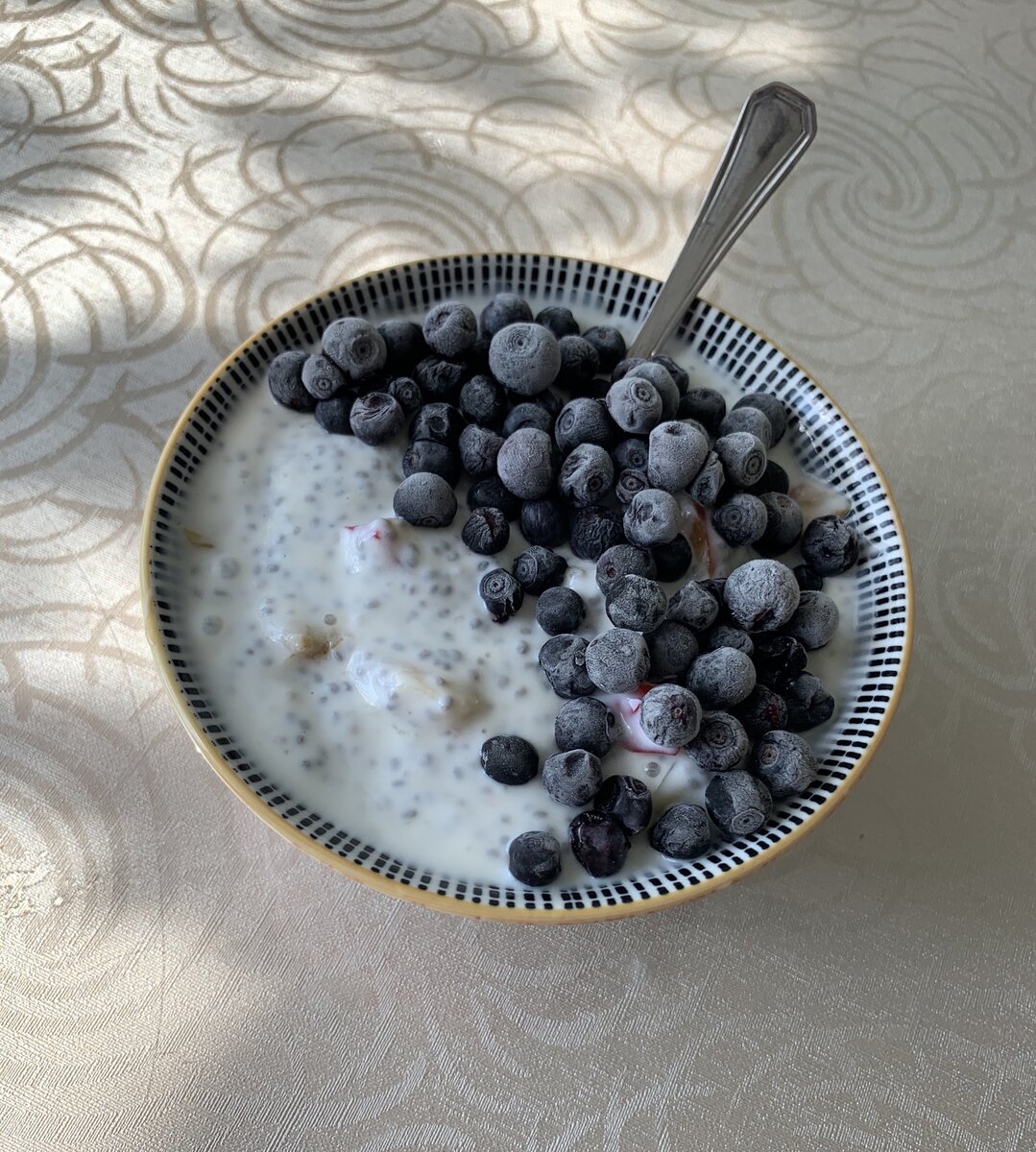 Перемешиваем 2 ст. ложки чиа с 1/2 стакана молока. Ждем что 10-15 мин. И добавляем начинку( орехи, фрукты, 🍓 )