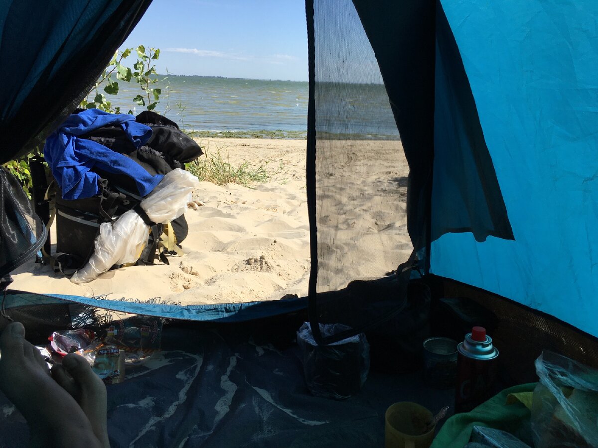 Маршрут: с.Круглое - станица Староминская. Проехал 88 км. Утром приготовил завтрак вскипятил в чайнике кипятка уже то есть заварил кипятком чашку кофе три в одном. После завтрака сборы лагеря загрузка велосипед и выезд на дорогу. Ну тут я решил пойти вдоль берега и выехать где-нибудь в другом месте так как вчерашний заезд показался мне слишком крутым и пыльно. По берегу дошел до площадки, где можно было подняться наверх дороге. Но здесь проблемка - от твердого берега залива отделяло дорогу песок и плюс еще после него крутой подъем. Пришлось мне почерёд на перенести Через песок велосипед затем рюкзак с продуктами а потом уже загрузил все на велосипед только чем подняться в гору. После такого трудного затяжного подъема толкачем решил отдохнуть, тем более отсюда с высоты открываются прекрасные виды на Таганрогской залив и береговую ленту. Посидел на краю обрыва и в тишине очень хорошо душевно отдохнул. Выехал по Лесопосадке в село круглое, проехал по центральной улице, а затем свернул