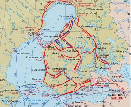 В феврале 1808 г. Россия в союзе с Данией начала военные действия в Финляндии. К апрелю русские войска овладели почти всей территорией этой страны. В крепости Свеаборг, капитулировавшей после полутаромесячной осады, было взято в плен 1500 шведов и захвачено 2023 орудия и 110 военных судов, включая два 28-пушечных фрегата, 6 шебек и 5 яхт. Однако в апреле шведы перешли в контрнаступление, вновь заняли северную, центральную Финляндию и высадили десант на Аландские острова.