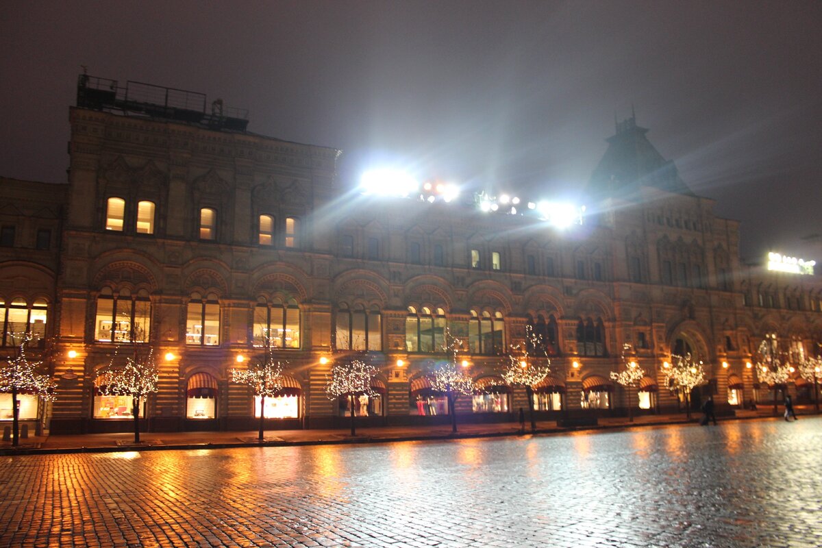 Прибыли мы на поезде рано. В семь утра в Москве еще темно. Поэтому Красную площадь мы увидели в огнях и без скопища людей. Что было нам на руку.