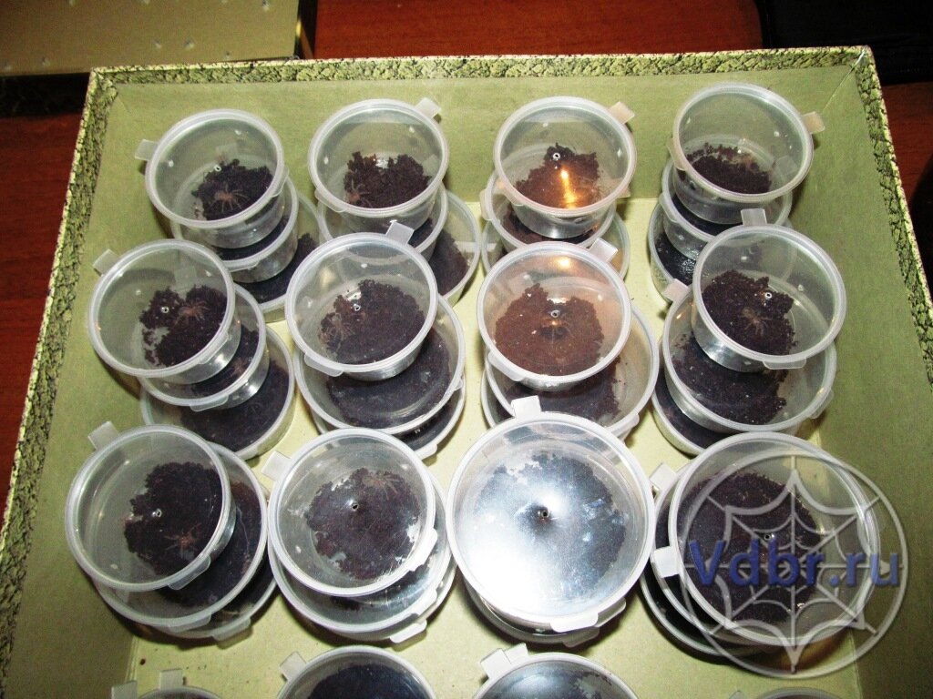 «С покупкой паука птицееда необходимо сразу же покупать террариум, который стоит немалых денег» – одно из популярных заблуждений новичков. В этой статье я хочу рассказать вам, как нужно содержать маленьких пауков птицеедов, которые во много раз меньше чем взрослая особь этого же вида. Подобрать оптимальные размеры емкости для содержания паука птицееда довольно просто, диаметр контейнера должен быть примерно 2-3 диаметра лап самого птицееда, высоту выбирайте сами, для наземных видов она не принципиальна, а древесным птицеедам высоту контейнера можно сделать в 2-3 раза больше диаметра. Именно в таких емкостях птицееды будут комфортно себя чувствовать, легко ловить кормовых насекомых, и не потеряются из виду. Обычно в стеклянных или других террариумах содержат половозрелых пауков птицеедов, преимущественно самок, а мелочь и подростки могут спокойно жить в пластиковых контейнерах. В каких контейнерах содержать птицееда: Как правило, пауков птицеедов содержат в пластиковых контейнерах ра