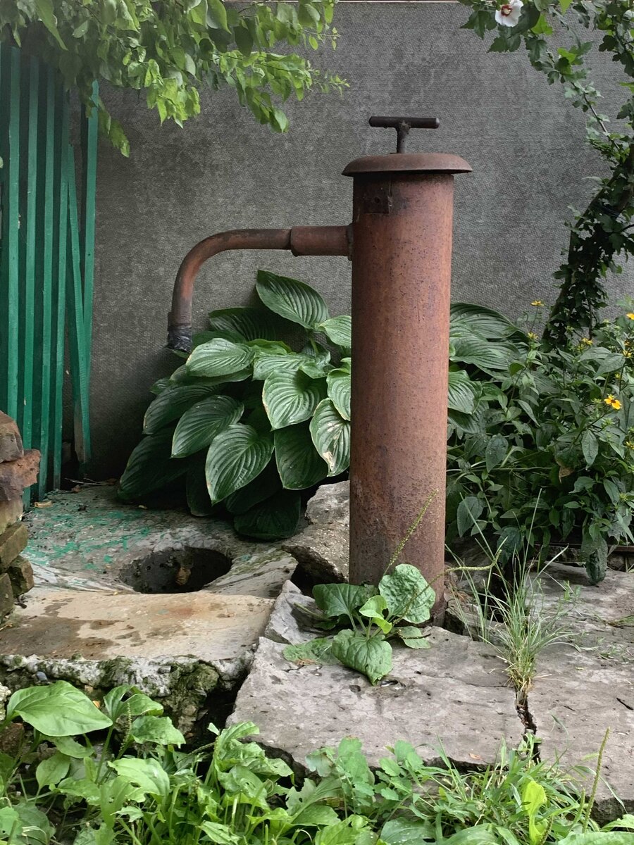 Внизу, под колонкой - люк водопровода. Сюда подключают новых пользователей, там находятся трубы и их краны. Вниз от колонки идет труба и тяга вниз: крутишь ручку и внизу где то открывается кран: идет вода. Такая конструкция колонки не позволяет промерзнуть колонке зимой:
