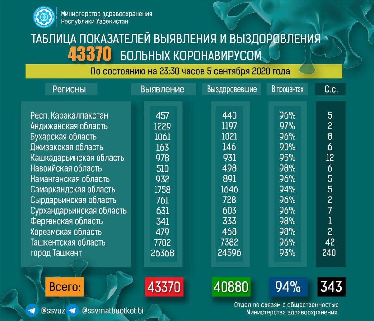 Узбекистан, Ташкент – АН Podrobno.uz. В Узбекистане за сутки, с 4 по 5 сентября, было выявлено 295 больных коронавирусом. По состоянию на 5 сентября на 23:30 число случаев заражения коронавирусной инфекцией достигло 43370, сообщает корреспондент Podrobno.uz со ссылкой на Минздрав. "За сутки от коронавирусной инфекции в Ташкенте умерли 3 человека, в Ташкентской области – 1. Всего за время пандемии скончались 343 человека", – отметили в министерстве.
