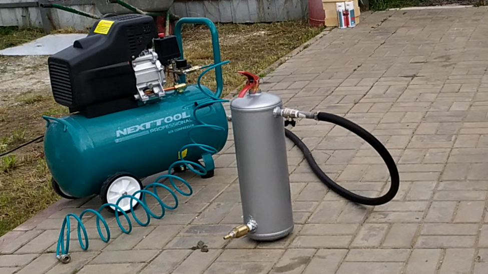 после сварочных работ, хотел огнетушитель полностью зачистить до металла, но решил обойтись только наждачкой, сделал матовую поверхность и все обезжирил, штуцеры обмотал скотчем, дабы избежать попадания краски на резьбу, развел краску до более текучего состояния, чтобы можно было красить краскопультом через компрессор (кстати красил первый раз компрессором, но был очень доволен) компрессор у меня не самый мощный 270л/минуту, объем расширительного бака 50 литров, но мне пока для моих задач, вполне достаточно, кому будет интересно приобретал я его в компании NEXTTOOL компрессор