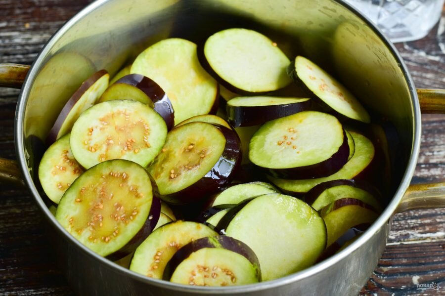 Баклажаны режутся кружками, корочка не счищается.