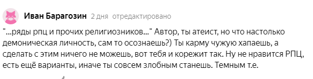 Значит так, при всем уважении к изысканиям Рериха и Блаватской, я их никогда не читал, не читаю и вам не советую. Хотя могу признаться, я наискосок просмотрел несколько книг Блаватской, понял что к реальности того что есть Шамбала - ее книги отношения не имеют и захлопнул их навсегда. Ну, хорошая фантазия была у обоих исследователей старых текстов, надо же было на чтото кушать. К истине - их материалы имеют отношение процентов на 5-15. Второй момент - корежит в данном случае именно автора коментария, ибо он не логичен, я мог не писать РПЦ, я мог просто обойтись словами "служители религиозных культов", без указания принадлежности к конкретной религии. Ибо это не имеет значения, какому идолу кто поклоняется. Разницы нет никакой. Кроме того мою версию там изложенную - спустя несколько дней подтвердила одна из статей на портале Кредо.ру, так что можно считать - что мое пророчество начало сбываться. Еще один важный нюанс - я не являюсь - ни сектантским гуру, ни атеистом, ни верующим. Мои статьи не для, уж простите меня, несчастной эзотерической гопоты в духе помаши палкой получишь результат, а для тех желающих саморазвития которые имеют интуицию и аналитическое мышление в первую очередь, а также не привязаны к определенной традиции, но ищут полезное всюду, выкидывая мусор без жалости и с презрением. Да я даймон. Но это не означает что простые смертные две души, имевшие фамилии блаватская и рерих должны были бы меня обучать. Скорее наоборот, я и другие лорды должны были бы их обучать, однако - большинство из них отрицает какую либо свою причастность. Хотя был один иерарх, который сознался. И за это его лишили престола и казнили,(это был лорд Мархосиас), от его системы остался только его легион подчиненных, перешедших в другое пользование. Более того эти двое нас не имеют никакого права обучать, в том числе и через свои книги. Для нас, лордов, отдельный человек, если он на нас нападает - слишком малая единица, чтобы за энергетическое воздаяние в виде мелкого сглаза ему, нас наказывал скажем Абсолют. Единичные случаи - они не рассматривают, и как правило даже если и касается - то рассматривают в нашу пользу в основном. Не тот масштаб, вас же не судят по 105 статье УК РФ, за то что вы прихлопнули таракана, который полз у вас по ноге... Я и так делаю большое одолжение всем читающим, почти не надеясь на равнозначную отдачу, хотя бы интеллектуальную, тем что канал находится на открытом ресурсе, и я не собираю секту, как например тот же Грабовой, которого мне там рекламировали почитать, осужденный по 158укрф за якобы "воскрешение" бесланских жертв. Мне он неинтересен ни как личность, ни как душа, разве что забрать на корм духам, когда он перейдет в мир иной. Также там говорили мне о некоем А.Петрове. и еще некоторых других. Наконец - лучше обматерю я, нежели я промолчу, а потом к нападающей душе подойдет кто нибудь из моих подчиненных и либо крепко огреет, даже без моей команды, либо подаст на эту душу жалобу например в кармический совет, кой делами обычных людей занимается. Ибо я предупреждал на страницах блога об этом неоднократно, не говорите что не было.