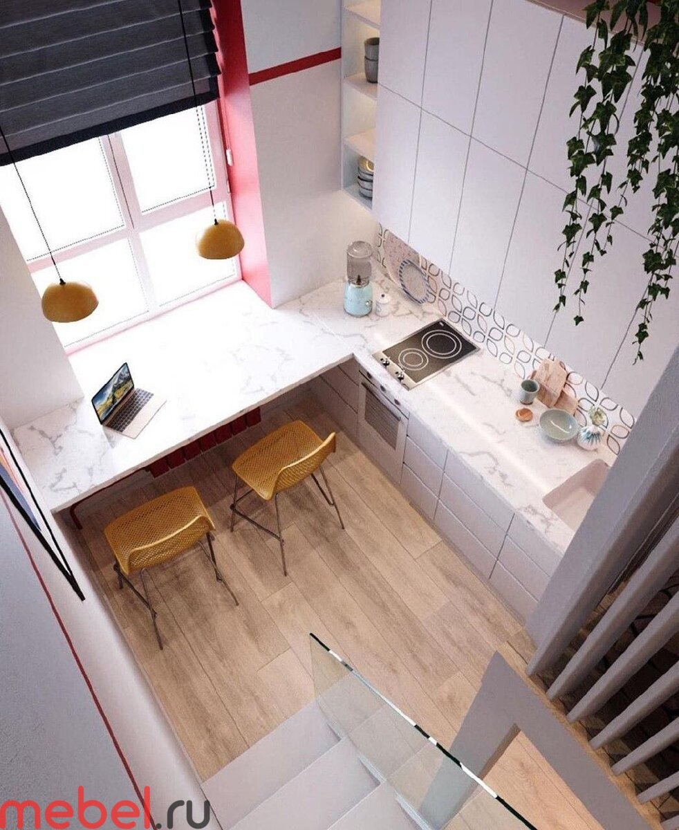 Когда видишь этот дизайн-проект Евгении Матвеенко, хочется сказать: да это же невозможно! И опять помянуть анекдот про то, сколько человек помещается в запорожец. Потрясающая продуманность, отличный подбор мебели, всё на своём месте — и в итоге в студию площадью 17 квадратов, которая некоторым покажется и для одной комнаты тесноватой, не то что для целой квартиры, поместилась: Вау! Действительно, и слов-то других нет. Дальше покажем квартиру во всех ракурсах и планировку тоже приложим, читайте статью до конца! А если ищете мебель для самых маленьких студий, загляните на наш сайт — там много вариантов. Конечно, вы уже догадались, в чём секрет этой студии. Всё просто — в узком и длинном помещении очень высокие потолки. Целых 4 метра! Этого оказалось достаточно, чтобы не пытаться впихнуть невпихуемое на первый этаж. Дизайнер решила проблему нехватки места просто и изящно: сделала второй. На первом остались кухонная зона, зона гостиной, прихожая и один из санузлов, а кровать, второй сану